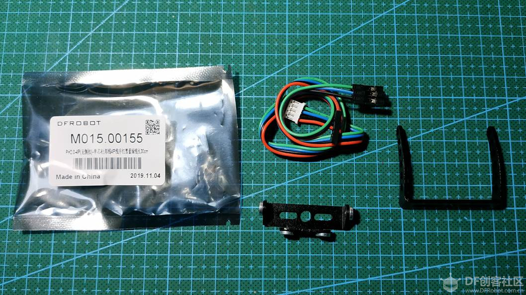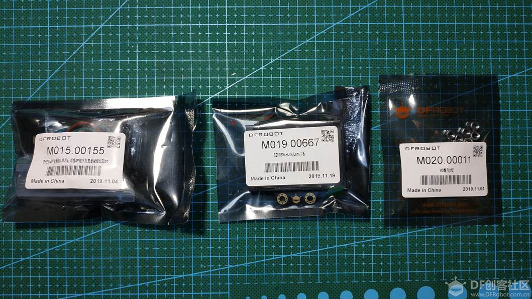 三个防静电袋包装,分别是支架与杜邦线、哈士奇主板、M3螺丝螺母。