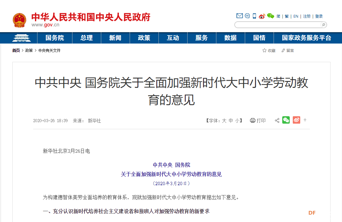 结语3月26日,中共中央 国务院发布了《关于全面加强新时代大中小学劳动教育的意见》。