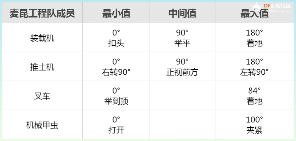 要点提示如何读取遥控器的红外编码?编写测试程序,通过串口观察并记录相应按钮的红外编码。 游戏手柄怎么用?可以直接读取不同按钮对应引脚的数据,也可以使用汤老师编写的用户库。 摇杆怎么用?同样编写测试程序,通过串口观察摇杆临界值(最上方、最下方、最左方、最右方),了解摇杆的控制范围。 舵机角度是否有限制?麦昆工程队采用的是 180 舵机,范围是 0 到 180。但不同工种由于结构和安装角度不同,存在不同的限制。以老师提供的这套麦昆工程队为例,具体角度范围如下: 操作指南1.选择合适的小车; 成果展示装载机+红外遥控