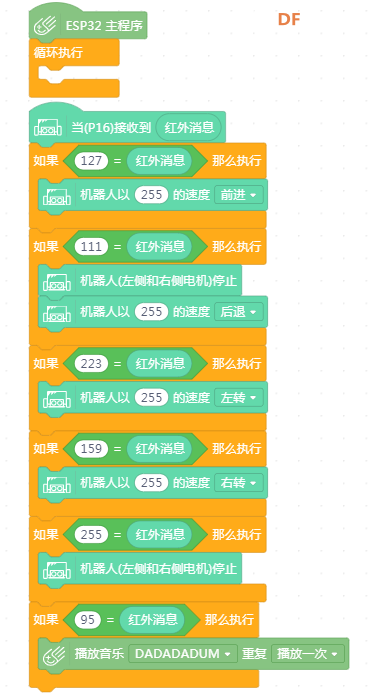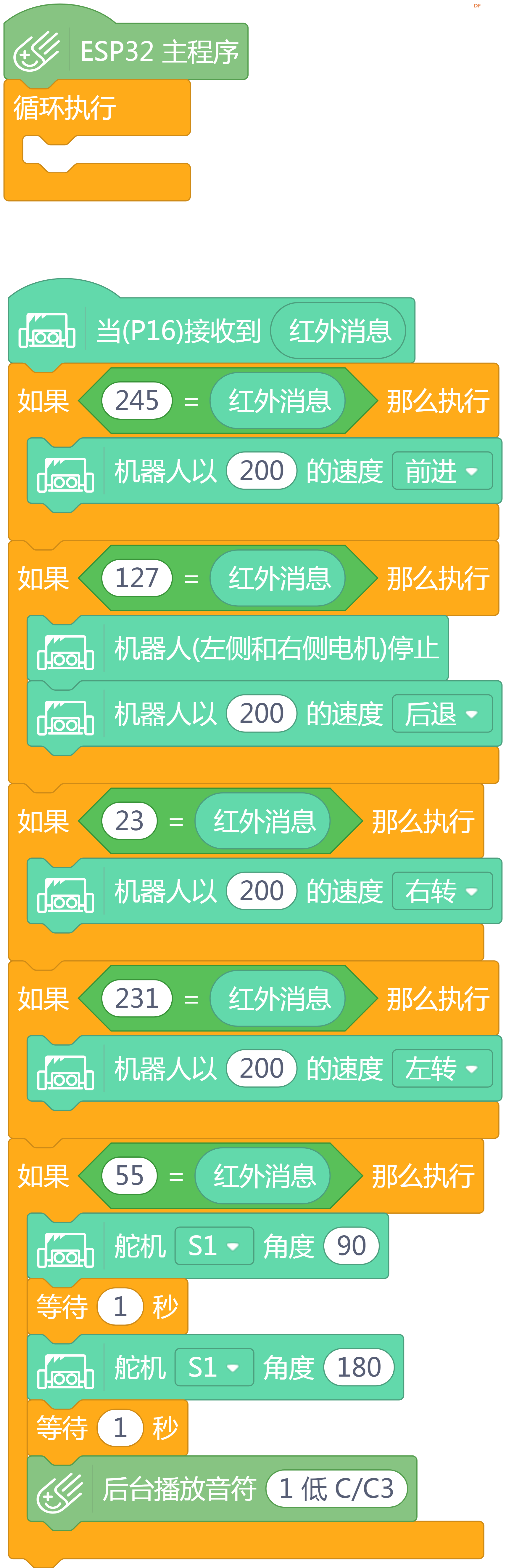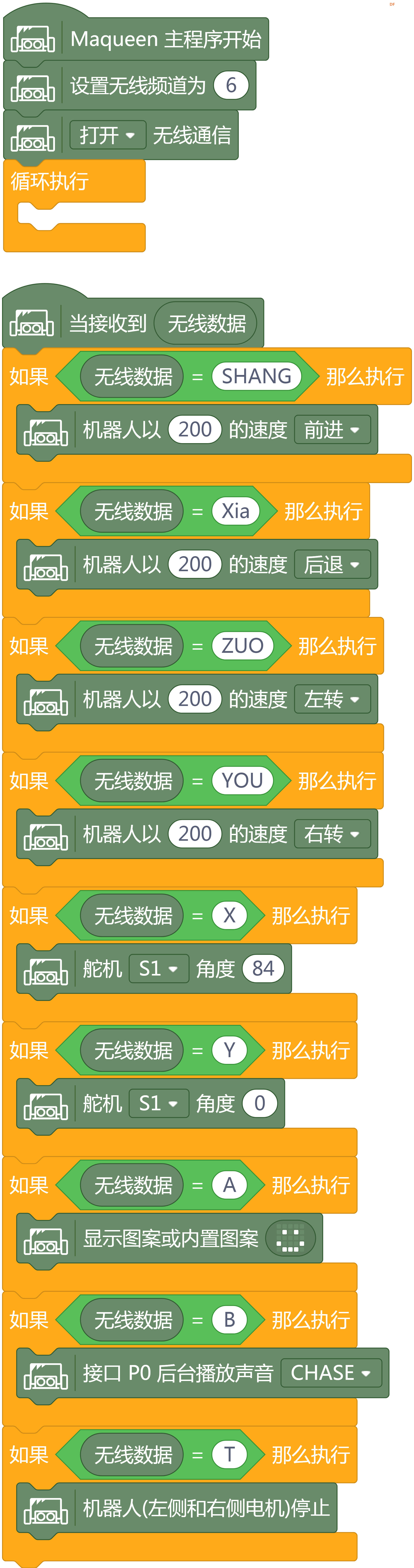 思路分析麦昆可以做很多运动,比如前进、后退、打开夹子、翻车斗等。一般情况下,我们在程序中让麦昆先后执行特定的动作,并不受我们控制。如果要实现遥控功能,我们需要用到红外遥控器或者游戏手柄。 遥控选型方案一:红外遥控器麦昆车头有红外接收模块,可以接收红外遥控器发送的信息。对接收到的红外信息解码后可以执行不同的动作。 ![]() ![]()