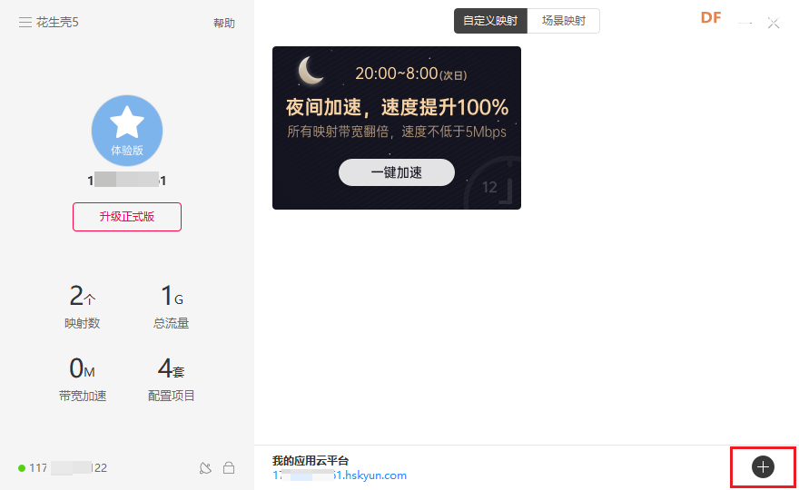 按下图做两个端口映射,其中外网域名是随机生成的,直接选择即可,如果想更换可以在花生壳购买其他名字的域名(收费服务,自行选择),内网主机填写127.0.0.1表示当前客户端运行的主机。