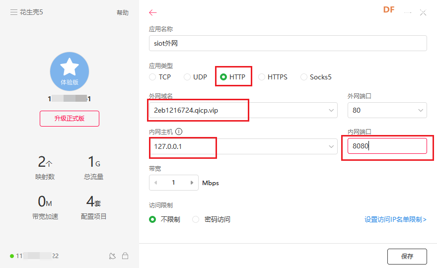 因此测试了一下是否可以通过花生壳内网穿透将SIoT的端口映射出去从而实现外网访问,测试结果是可行,而且整个过程都是免费的 【注意(2021年备注):现在监管严格了,创建http端口需要花6块做一个实名认证】。