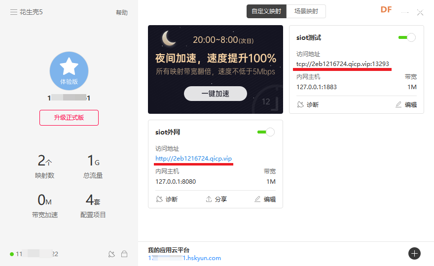 登录完成后为免费账户,免费账号有2个映射端口数,每个月1G流量,对于SIoT的使用来说完全够了。