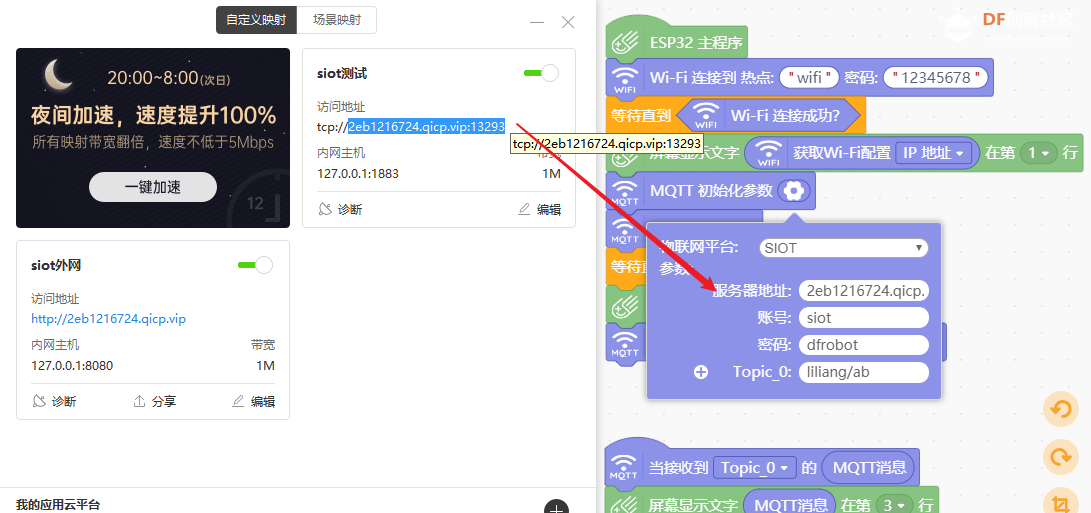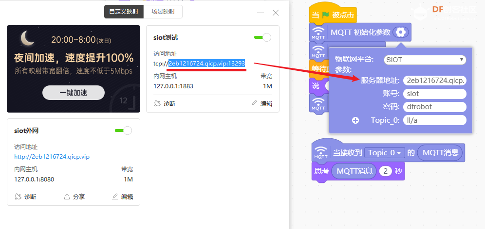 其中MQTT服务器填入花生壳1883端口映射出来的网址(不包含tcp://)